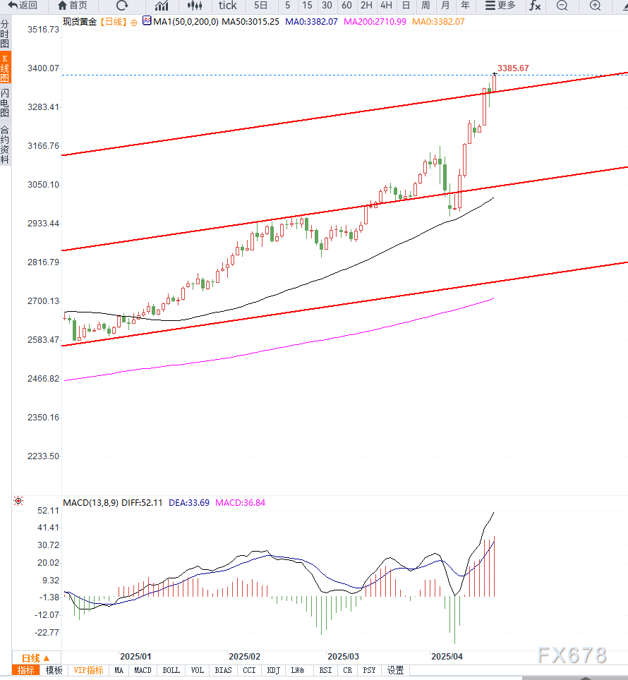 尽管多头行情强势,但技术面显示黄金已处于超买状态,日线RSI指数超过70,表明短期内可能出现调整或盘整走势。若出现回调,支撑位分别在3350美元、3328美元和3300美元,关键支撑则在3284美元区域。