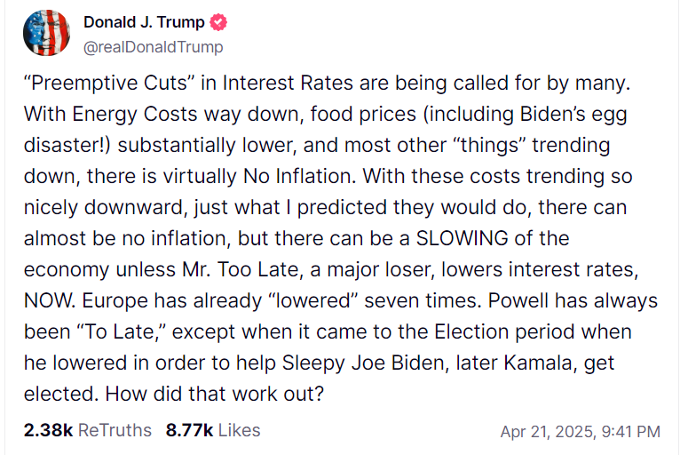 特朗普当天在Truth Social上写道,由于能源和食品价格下降,几乎不会有通货膨胀。在提到鲍威尔时,他表示:“但经济可能会放缓,除非大输家‘太晚’先生现在就降低利率。”