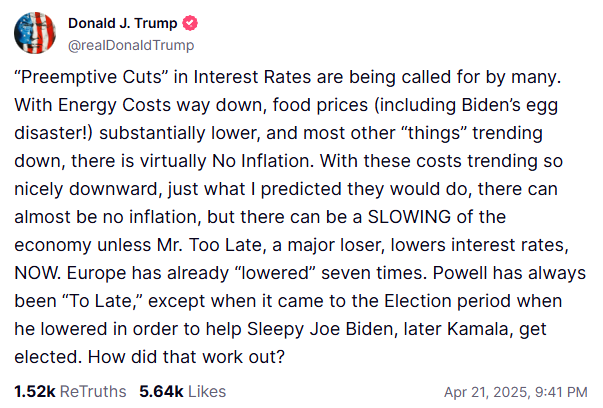 发稿前不久,特朗普发帖称,“已经有许多人呼吁采取‘预防式’降息,因为能源成本已经大幅下降,食品价格(包括拜登引发的鸡蛋灾难)大幅走低,以及大多数其他类别也趋于下降,实际上已经没有通货膨胀了。”