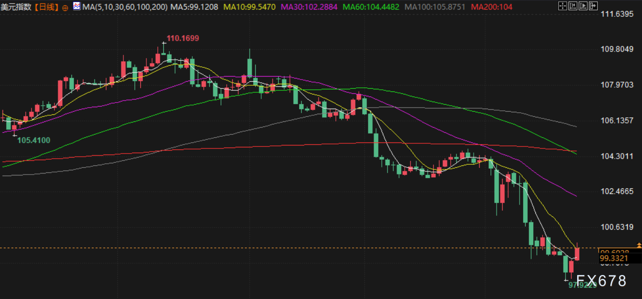 衡量美元兑其他六种主要货币汇率的美元指数上涨0.6%,报98.937点,前一交易日最低下探至97.923点,为2022年3月以来的新低。