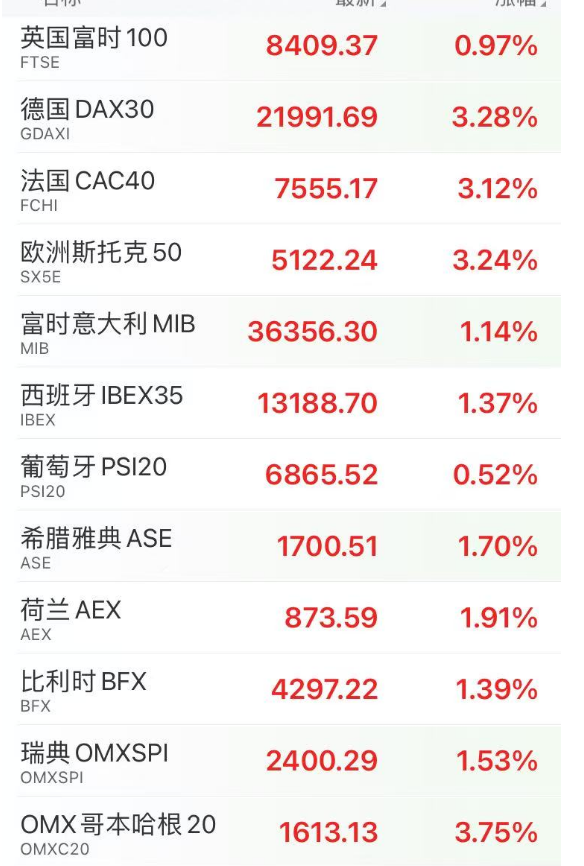 同时,欧股直线拉升,截至发稿,法国CAC40指数大涨超3%,德国DAX指数涨3.28%,欧洲斯托克50指数涨3.24%。