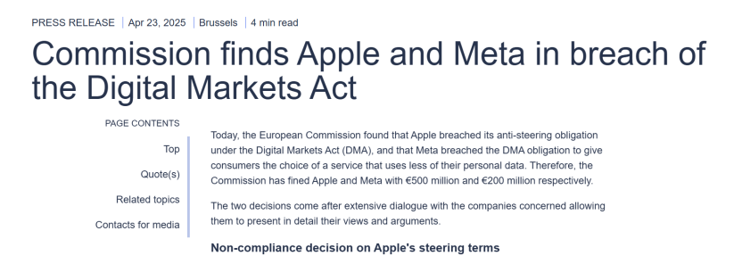 根据欧盟委员会的声明,苹果公司违反了DMA规定的“反引导条款”(anti-steering obligation),而Meta公司则是违反了DMA中,有关让消费者有权选择使用“较少其个人数据服务”的规定。