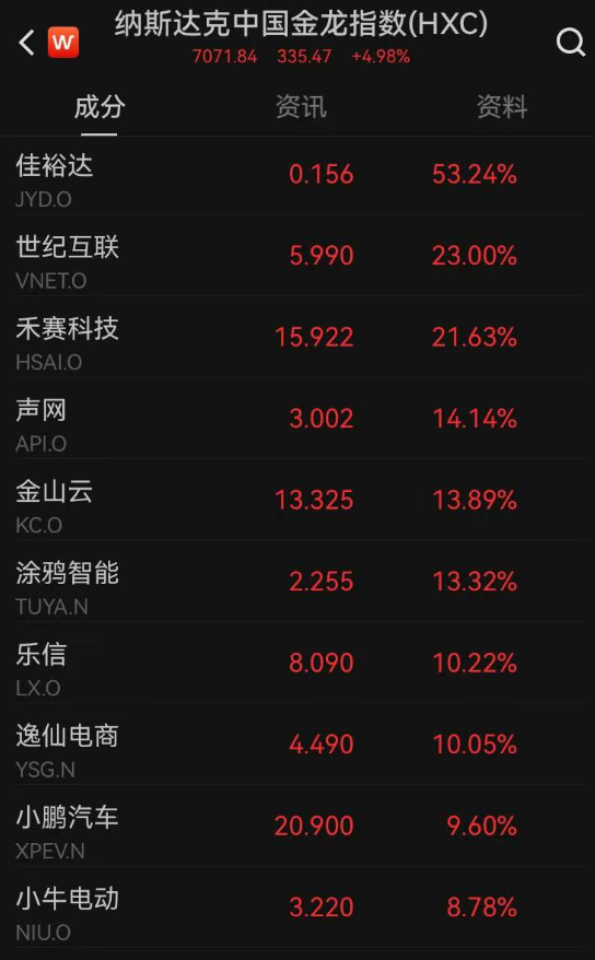 纳斯达克中国金龙指数涨幅一度超5%,截至发稿,涨幅为4.98%。