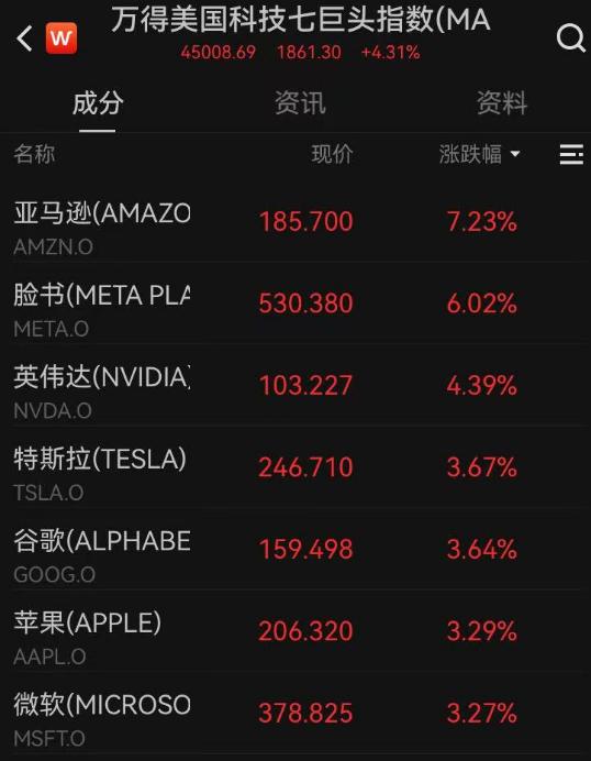 美国科技七巨头股价均大涨,其中亚马逊涨超7%,脸书涨超6%,特斯拉涨3.67%。
