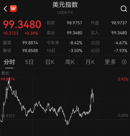 美元指数一度涨逾0.9%,上逼99.9,目前涨0.38%。