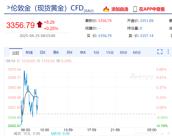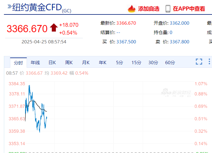 截至发稿,现货黄金涨0.25%,纽约黄金涨0.54%。