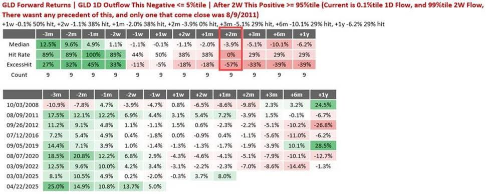 野村观察到当前市场出现“黄金狂热过度”的历史性异常值:数据显示,GLD在两周内经历了超过历史95%水平的资金流入,随后又出现了同样超过历史95%水平的单日资金流出。