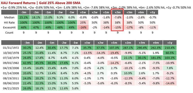 野村的历史数据分析显示,每当金价与200日均线产生如此大的偏离时,金价在接下来2个月内往往出现明显回调。