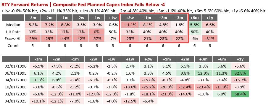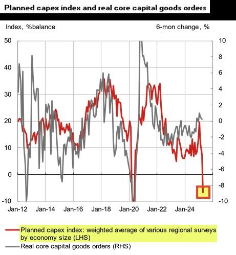 野村经济学家团队追踪的“美联储综合预期资本开支指数”(Composite Regional Fed Planned Capex Index)最近跌破-4。该指数汇总了各区域联储调查数据,按经济贡献度加权平均计算。