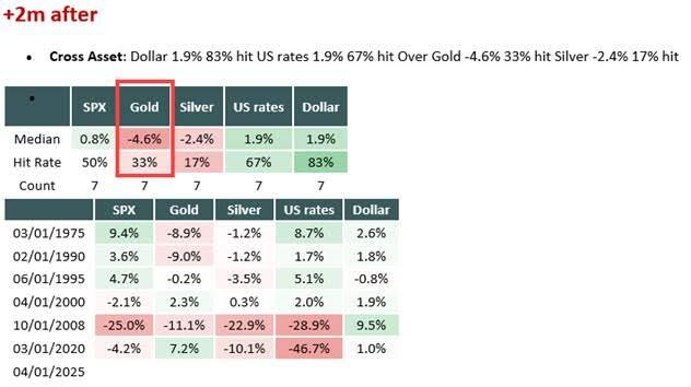 更直接相关的是,当该指数跌破-4时,黄金在随后2个月的表现往往不佳。