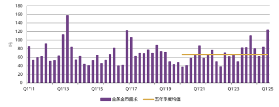 与金饰消费形成鲜明对比,一季度金条与金币投资创下历史第二高的季度水平,仅次于2013年二季度。一季度金条金币需求达124吨,环比激增48%,同比上涨12%,考虑到同比的双位数增长是基于2024年一季度本就很高的基数之上,这一成绩便更为亮眼。