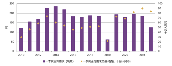 l 金饰需求持续承压,一季度同比锐减32%至125吨。创纪录的高位金价抑制了消费需求和零售商补货量,加之零售店数量缩减、消费降级,进一步压制了黄金饰品需求。