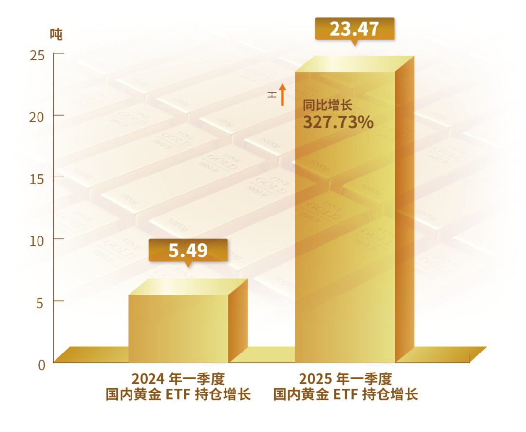 2025年1季度,国内黄金ETF持仓量增长23.47吨,较2024年1季度增仓5.49吨同比增长327.73%。至3月底,国内黄金ETF持有量为138.21吨。
