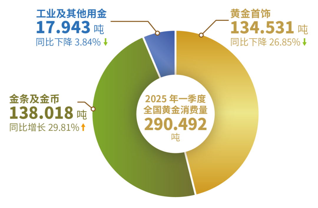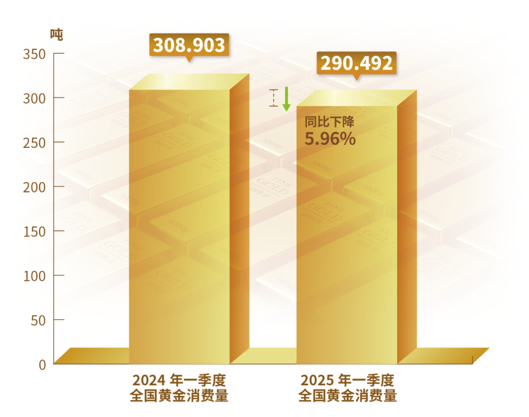 4月28日,中国黄金协会发布的最新统计数据显示,2025年一季度,我国黄金消费量290.492吨,同比下降5.96%。其中:黄金首饰134.531吨,同比下降26.85%。金条及金币138.018吨,同比增长29.81%,按3月底国内价格730.8元/克计算,金条及金币总投资金额约1008.6亿元。