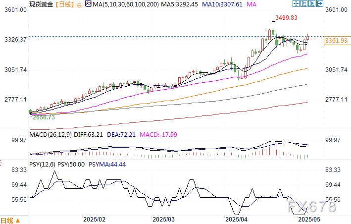 现货黄金日线图 来源:易汇通北京时间5月6日11:01 现货黄金 报 3358.67 美元/盎司