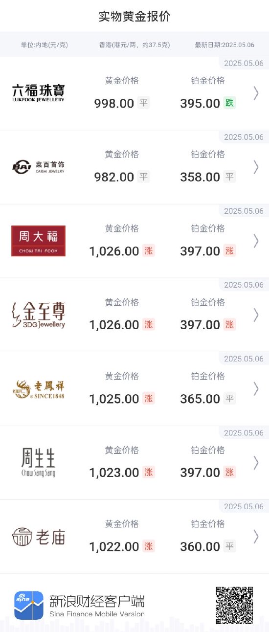 财联社5月6日电,国际金价维持前日上涨态势。截至上午10点,COMEX黄金一度触及3390美元/盎司,现货黄金一度突破3380美元/盎司。受国际金价影响,国内多家金店足金饰品价格再度突破千元。其中,周大福足金饰品价格上调至1026元/克,较前日每克上涨28元;老凤祥足金饰品价格上调至1025元/克,较前日每克上涨27元。