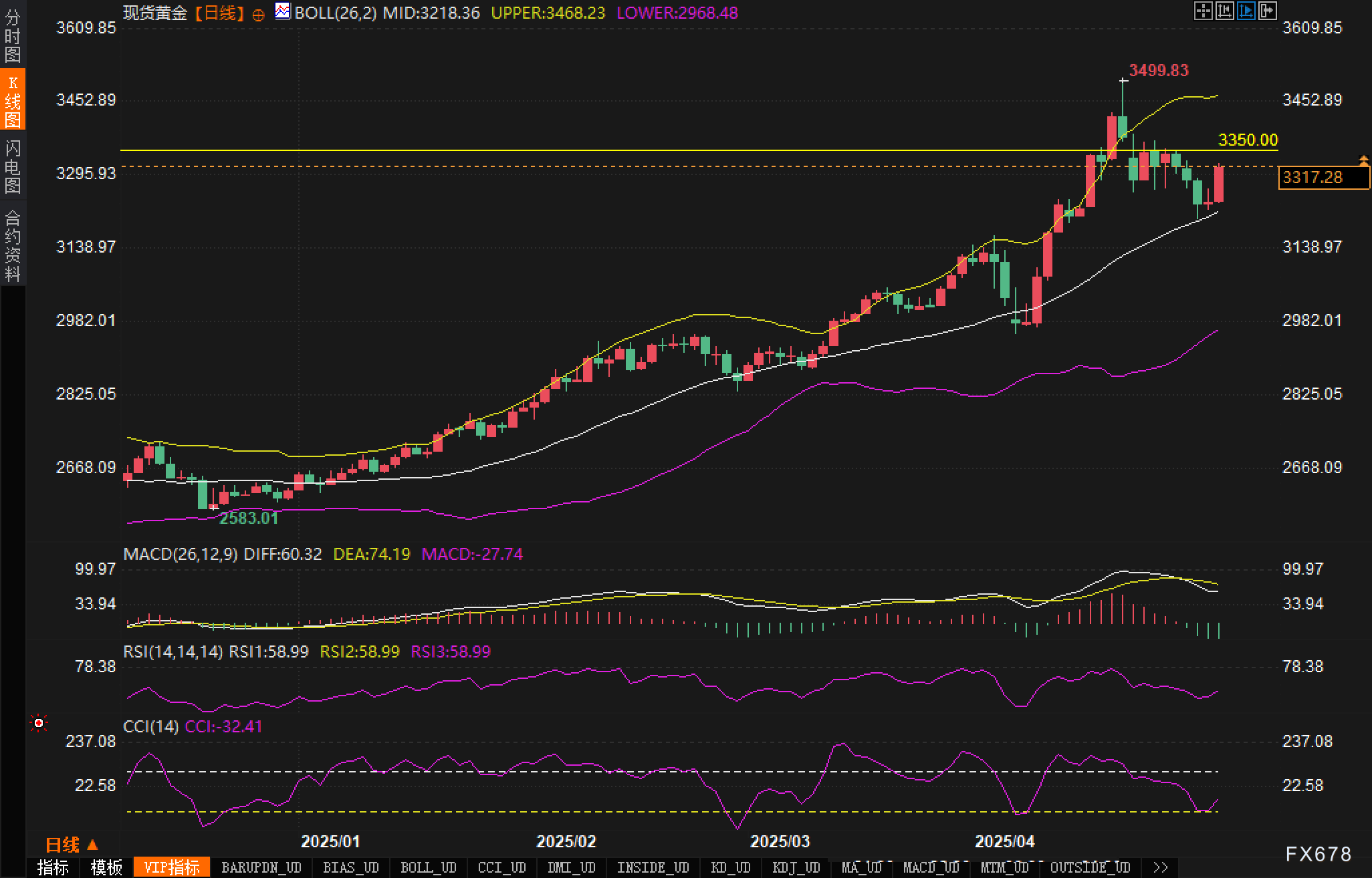 从日线图RSI指标来看,当前处于58.99的水平,尚未进入超买区域,表明短期内仍有上行空间。布林带指标显示,价格目前在中轨上方运行,上轨位于3468.23,下轨位于2968.48,表明当前处于强势通道中。