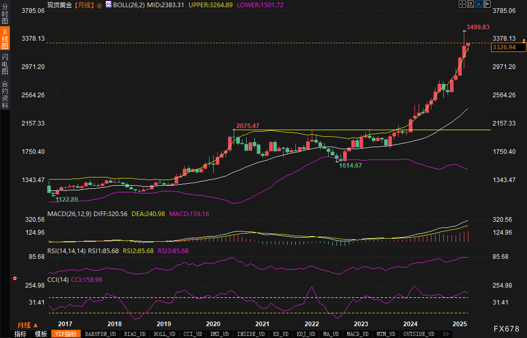 从月线图表分析,黄金突破颈线位成为关键触发点。该形态通过测量从颈线到头部底部的深度并向上投射,给出了约3200-3300美元区间的目标价位,这一目标现已实现。