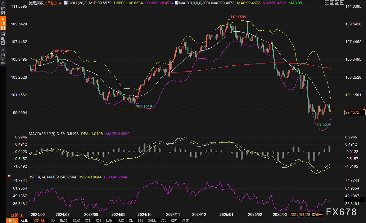 周三(5月7日),黄金与美元市场在本周美联储决议前夕呈现谨慎波动。美元指数(DXY)徘徊于日线布林带下轨97.1389与中轨101.2661之间,MACD显示空头动能减弱,RSI(14)40.9644暗示超卖区域反弹可能。现货黄金报价位于布林带中轨3297.03上方,MACD快慢线收敛,RSI(14)61.45反映多头动能温和占优。