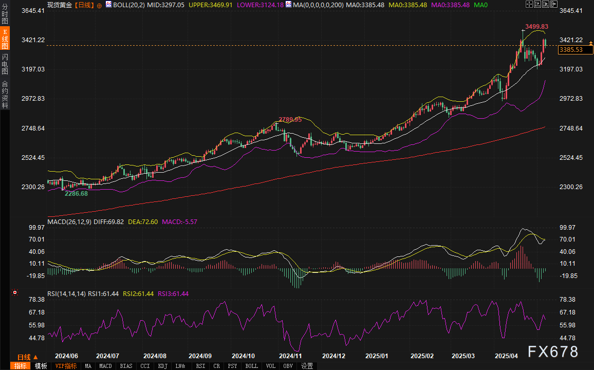 尽管如此,黄金的避险属性在当前不确定性中仍具吸引力。高盛首席经济学家Jan Hatzius指出:“软数据(如企业调研与新闻不确定性指数)已跌至疫情初期水平,远超典型事件驱动型衰退,反映市场对政策冲击的担忧。”这种“丑陋”的市场情绪为黄金提供了支撑,尤其是在美元指数未突破200日均线104.3585、动能偏弱的情况下。黄金若能守住布林带中轨3297.03,或在决议后因避险需求回升而挑战上轨3469.82。