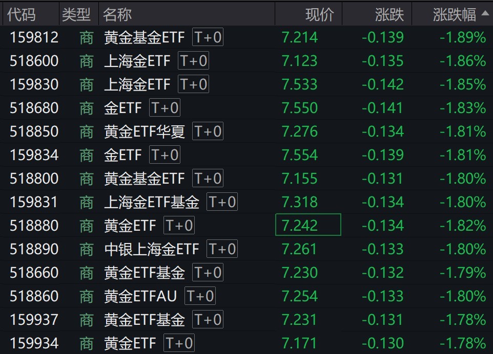 受盘面影响,商品黄金相关ETF早盘跌近2%。