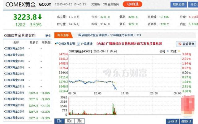 红星新闻5月12日消息,现货黄金直线下跌,日内跌幅扩大至3.59%,为5月1日以来新低。