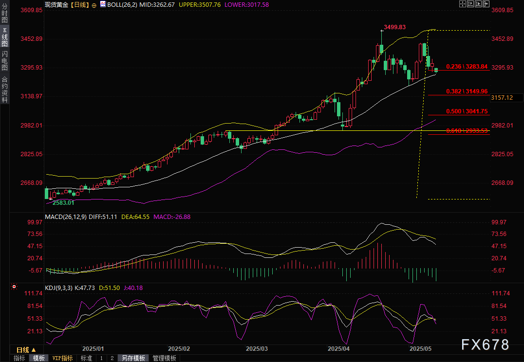 周一(5月12日)亚市盘初,现货黄金低开低走,截止7:00,最低触及3265.88美元/盎司,创近一周新低,较上周五收盘价下跌近60美元,跌幅约1.76%,因上周末中美经贸高层会谈在瑞士日内瓦举行,会谈取得实质性进展;这令提振市场冒险情绪,打压黄金的避险买需。普京提议于15日在土耳其恢复俄乌直接谈判、印巴停火的消息也打击黄金多头士气。