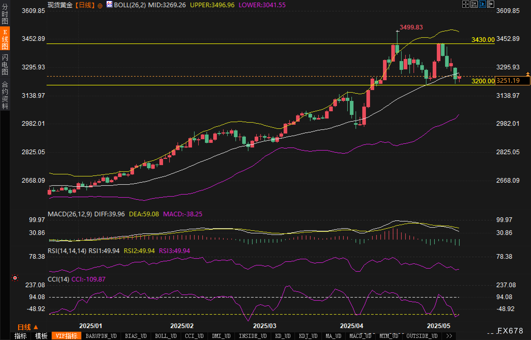 从日线图中可以观察到,近期黄金价格走势呈现出明显的技术特征。金价自3月以来形成了一条明确的上升通道,在4月突破3200关口后,曾一度触及3499.83高点,随后出现回调。目前金价位于3250美元附近,已经回落到上升通道的中下轨位置。