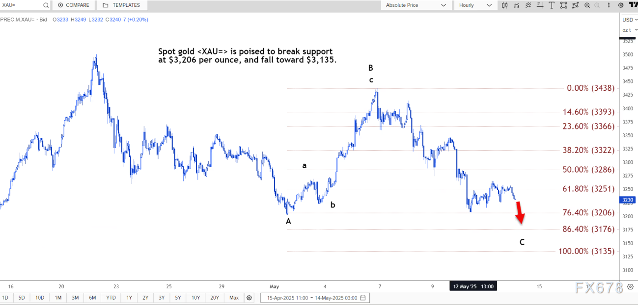 周三(5月14日)亚洲时段,现货黄金小幅走弱,目前交投于3227美元/盎司附近。路透技术分析师指出,现货黄金有望跌破每盎司 3206 美元的支撑位,跌向 3135 美元。