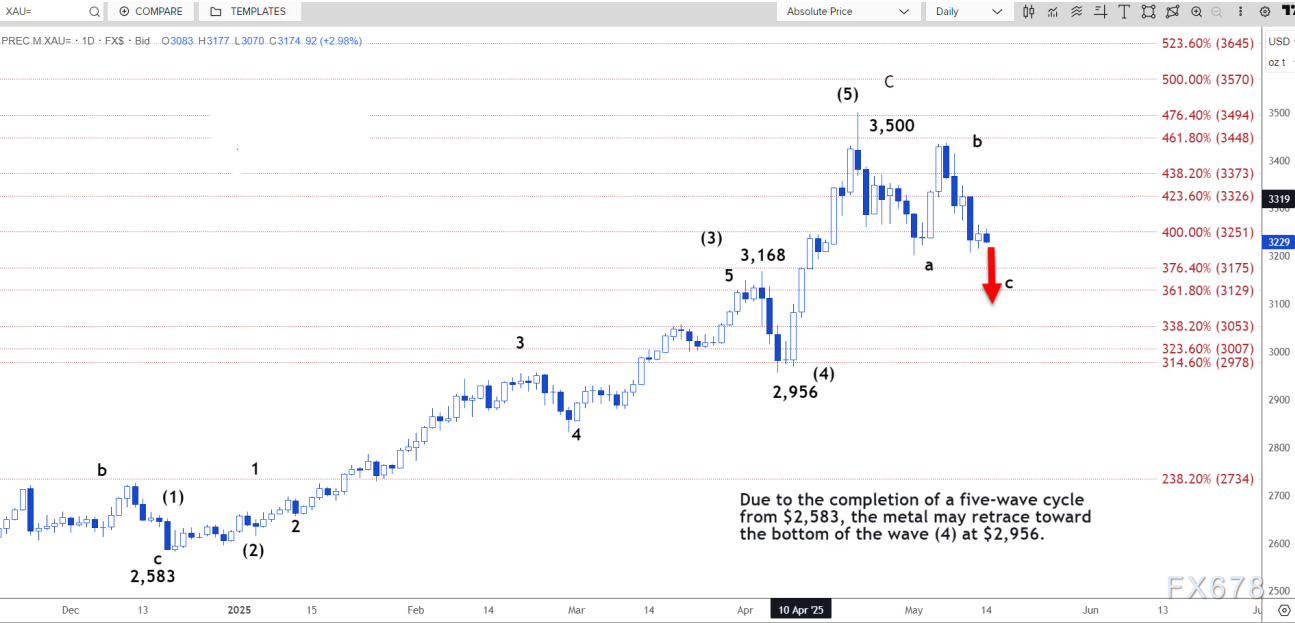 由于金价自2583美元起完成了五浪周期,金价可能回撤至(4)浪底部2956美元。自4月22日3500美元高点以来的形态看起来像一个双顶,这意味着目标位在2978美元,接近2956美元。