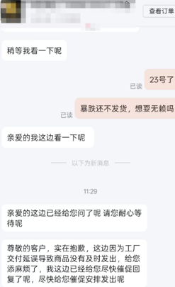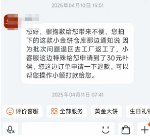 他咨询商家,商家答复他:“因为批次问题退回去工厂返工了,小客服这边特殊给您申请到了30元补偿,您这边订单申请一下退款。”