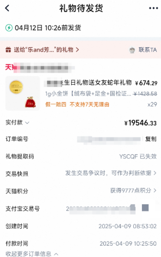 今年4月9日,他在某电商平台的某珠宝店下单了一款小金饼,克价为674.29元,总价为19546.33元,但直到4月25日,商家都没有发货。
