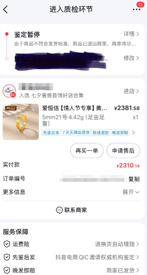 无独有偶,消费者张女士也向《消费者报道》投诉,她于今年4月2日在某电商平台的某黄金专卖店购买了一款黄金戒指,因圈口太小不合适,于4月7日申请了换货。