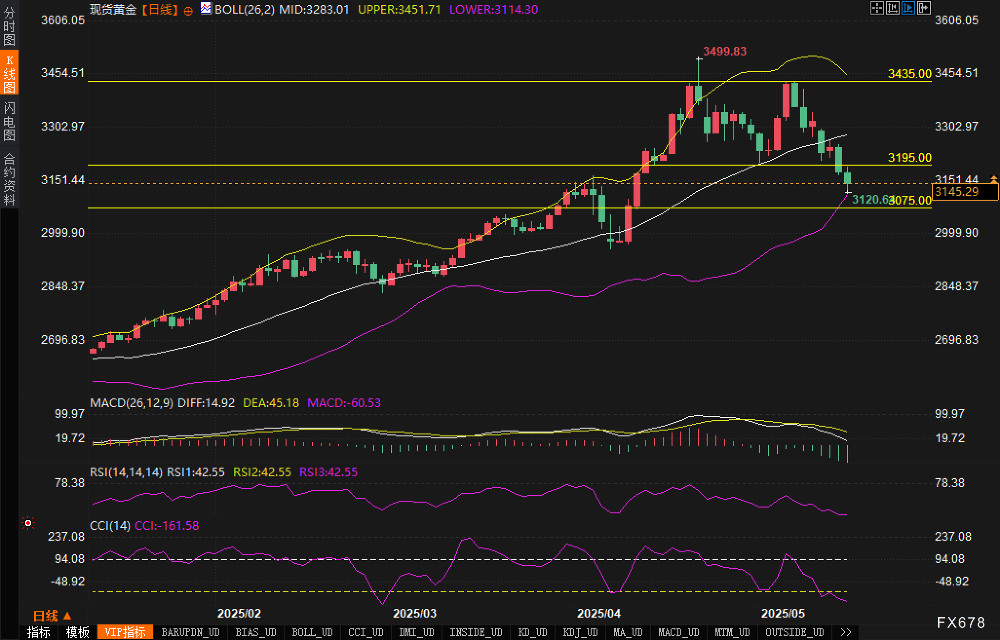 金价在日线图上展现出明显的调整趋势,自4月创下历史高点3499.83美元后走低,当前价格已跌破3195美元支撑位。布林带指标显示中轨位于3283.01美元,上轨达3451.71美元,下轨为3114.30美元,表明市场波动区间明确。金价目前接近下轨,若跌破可能加速下行。