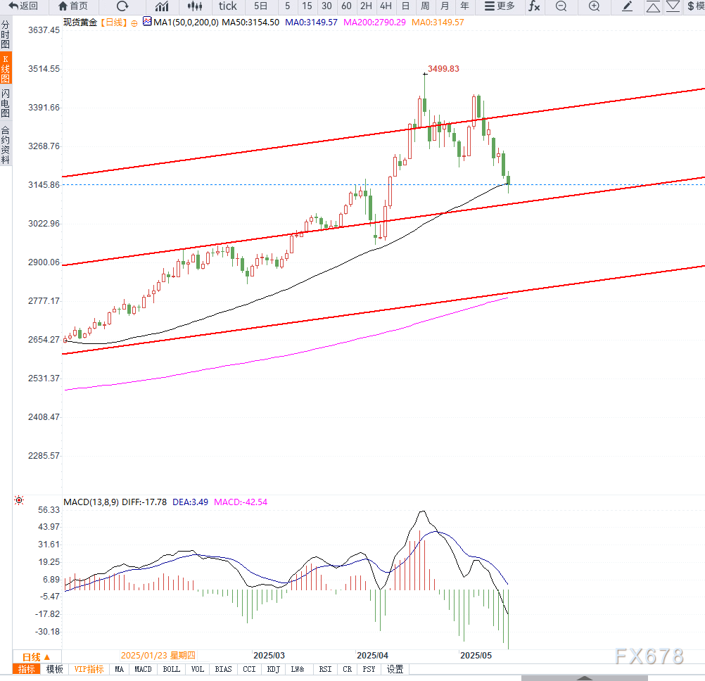 从技术面看,金价跌破3200美元关键支撑后,并一举下破自4月涨势以来的61.8%斐波那契回撤位(3168-3170美元),释放出明显的下行信号。日线动能指标(MACD、RSI)开始转入负面区域,表明下行动能仍未结束。