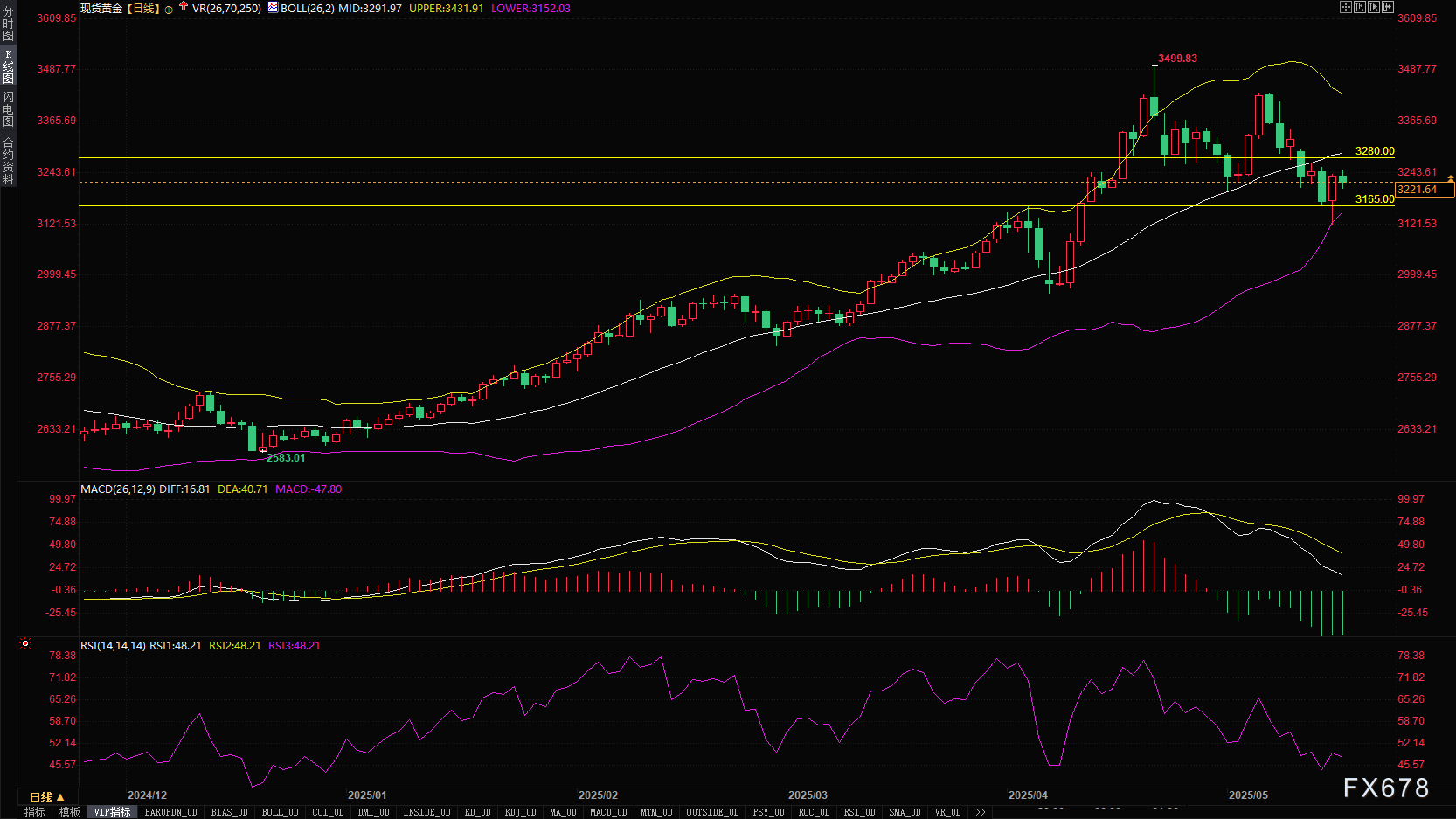 从长期趋势来看,黄金价格今年以来形成了明显的上升通道,目前价格正在此通道中运行。布林带呈现扩散状态,中轨处于上升状态,这表明长期趋势仍然向上,但短期可能面临调整。