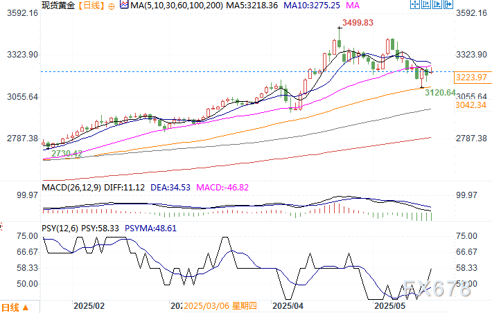 现货黄金日线图 来源:易汇通北京时间5月19日10:10 现货黄金 报 3223.97 美元/盎司