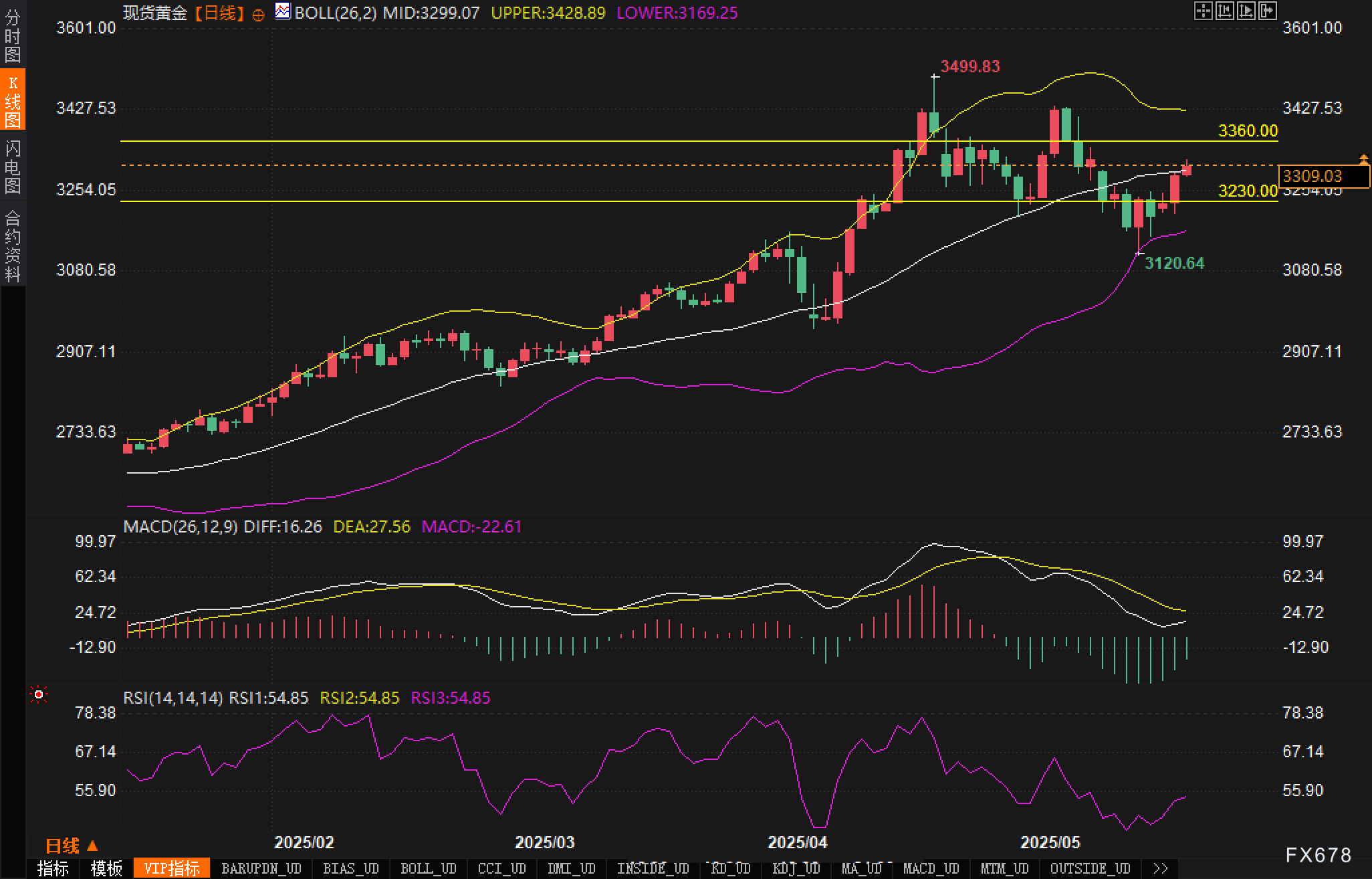 从日线图分析,现货黄金正处于关键技术节点。价格已突破3230美元,并在3300美元处获得支撑。布林带指标显示中轨位于约3299美元,上轨约3429美元,为短期目标区域。MACD指标中,MACD值为-22.61,显示短期动能减弱。然而,价格仍维持在长期上升趋势线之上,表明中长期多头格局未被破坏。