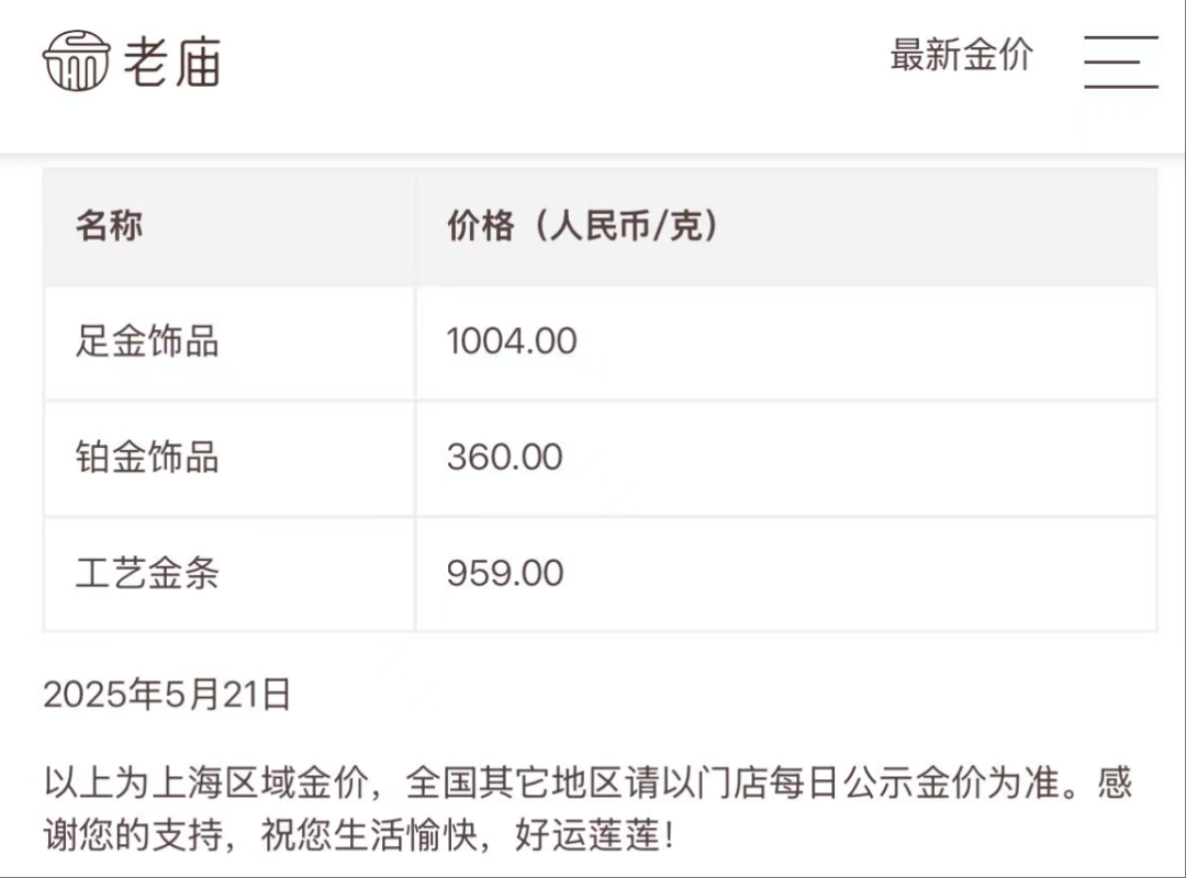 国内黄金品牌价格随之攀升,中新经纬21日查询发现,周生生足金饰品报价为1007元/克,相比前日982元每克上涨25元;老庙黄金足金饰品报价为1004元/克,相比前日977元每克上涨27元,一夜涨近30元;周大福金饰报价为1008元/克,较前一日982元每克上涨26元。