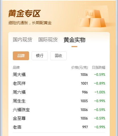 紧跟国际市场波动,国内金饰价格应声下跌,多个品牌金饰价格跌回千元附近。截至发稿,周大福金饰报价1006元/克,单日下跌0.59%;老凤祥金饰报价1001元/克,单日下跌0.89%;周六福金饰报价986元/克,单日下跌1%;老庙黄金金饰报价997元/克,单日下跌0.99%。