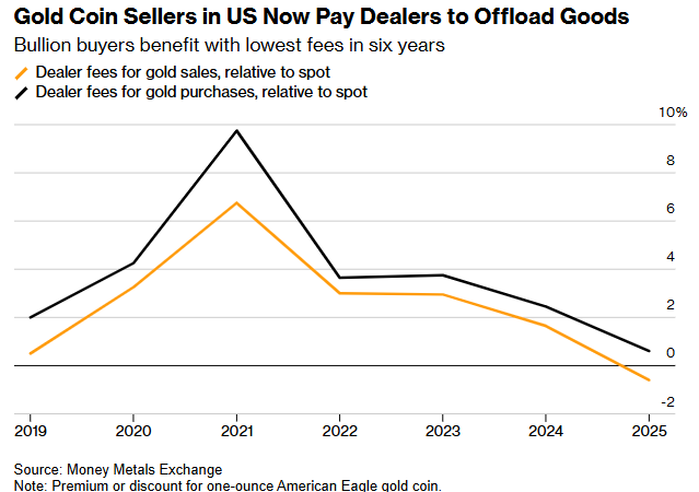 数据显示,美国市场上的金条和金币目前正出现供过于求的状况,部分贵金属经销商已将溢价降至六年来的最低水平以刺激销售。当散户投资者试图出售黄金时,现在需要支付给经销商额外费用才能成功脱手。