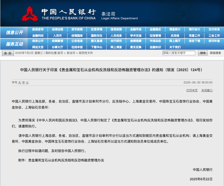 中国人民银行近日发布《贵金属和宝石从业机构反洗钱和反恐怖融资管理办法》(以下简称《办法》),明确贵金属和宝石从业机构的反洗钱义务,要求其建立健全反洗钱内部控制制度,开展客户尽职调查,履行大额交易和可疑交易报告义务,加强洗钱风险管理,并接受自律管理和监管。该办法自2025年8月1日起施行。