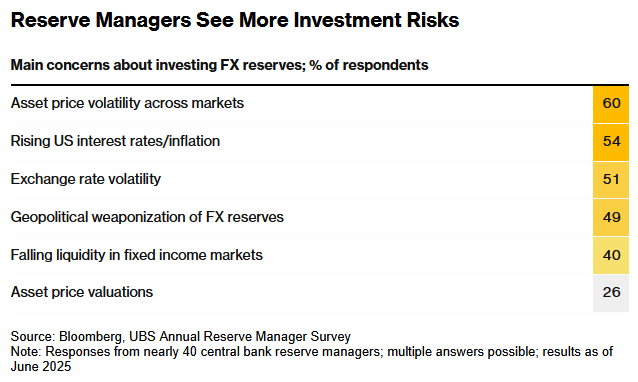 外汇“武器化”正成为各国央行储备管理者越来越头疼的问题,这也促使他们进一步增加黄金储备。据瑞银集团上月完成的一项对近40家央行的调查显示,将地缘政治背景下外汇储备“武器化”视为投资风险的央行比例在2025年大幅上升至49%,高于去年的32%和2023年的14%。