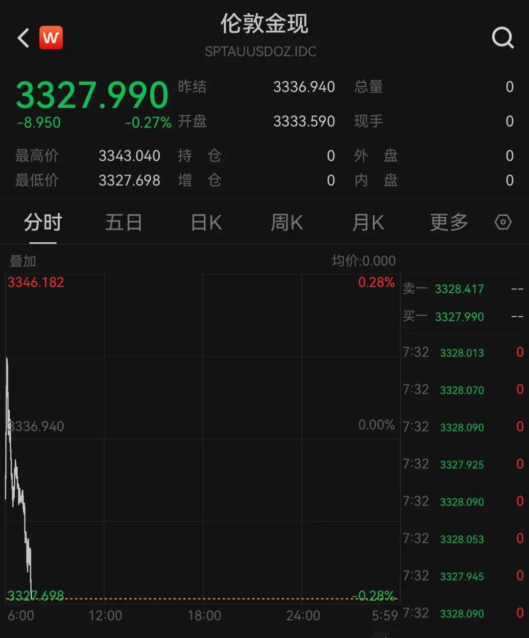 7月7日,伦敦现货黄金高开低走。截至发稿,最新报价为3327.990美元/盎司,跌幅为0.27%。