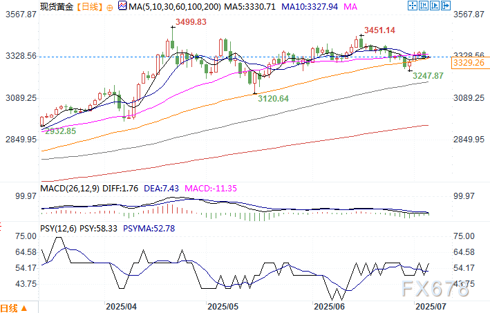 现货黄金日线图 来源:易汇通北京时间7月4日10:42 现货黄金 报 3329.26 美元/盎司