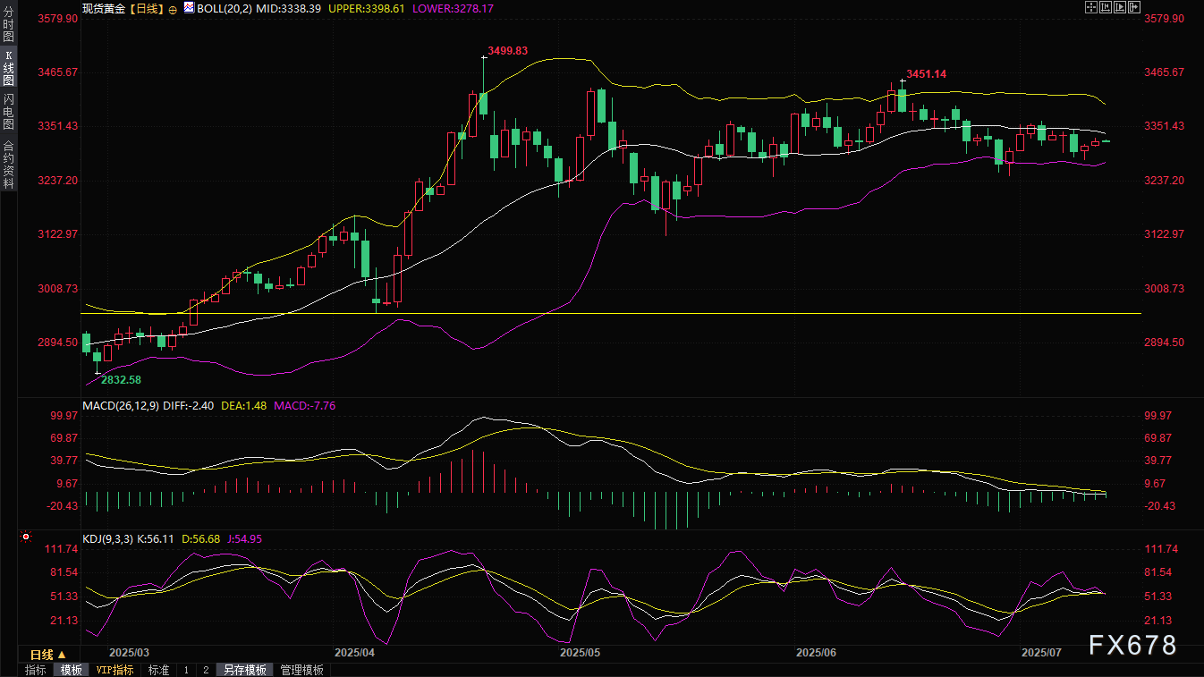 周五(7月11日)亚市早盘,现货黄金窄幅震荡,目前交投于3323.68美元/盎司附近。周四(7月10日),国际金价小幅收涨至3323.82美元/盎司,盘中一度触及3330美元关口,但最终涨幅受限。这一走势完美体现了当前黄金市场的矛盾格局:避险情绪与美元反弹的角力。