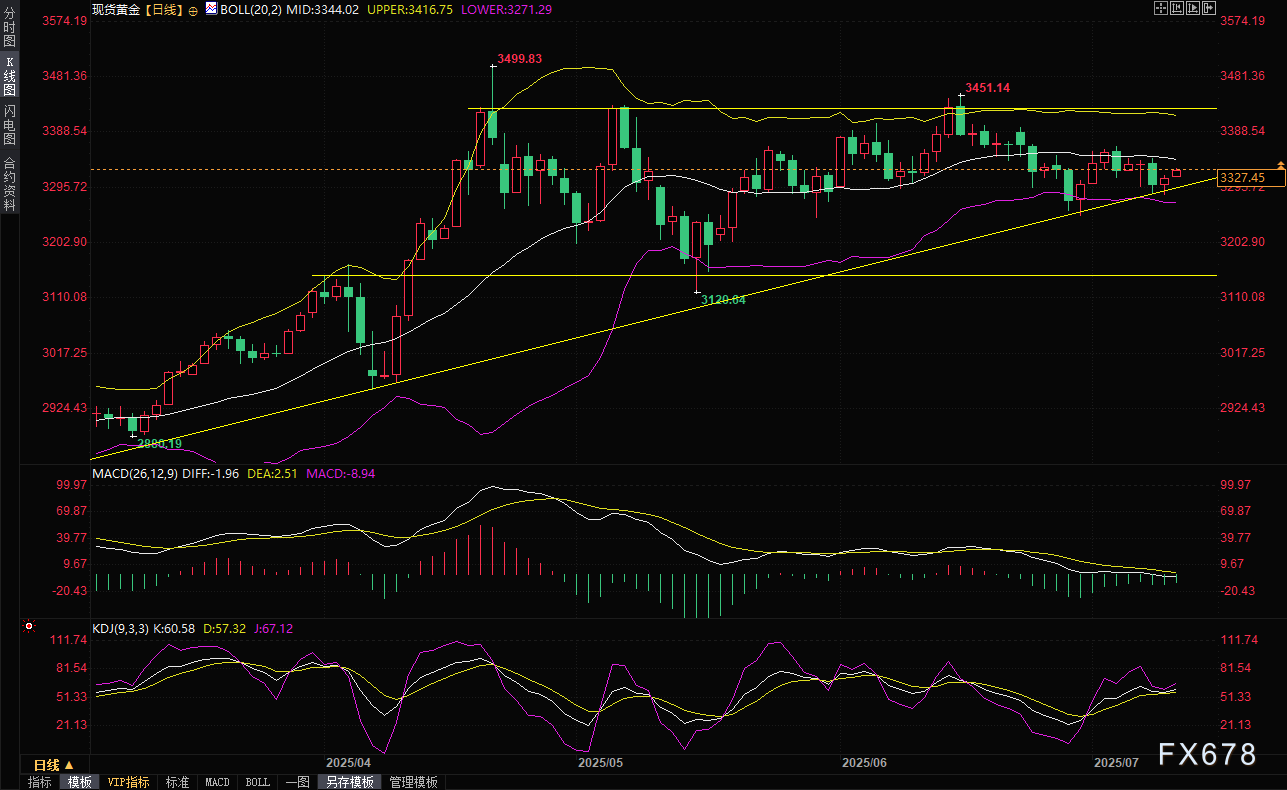 金价周四(7月10日)震荡走高,现货黄金一度逼近3330关口,涨幅接近0.5%,受助于美元和债券收益率小幅回落,同时随着美国总统特朗普扩大关税战,投资者正密切关注贸易谈判。