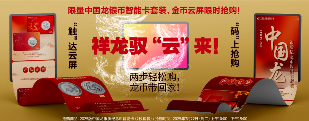 珍藏机遇,驭“云”而至!备受瞩目的2025版中国龙银质纪念币智能卡(2枚套装),即将于中国金币云屏开启震撼限时抢购!