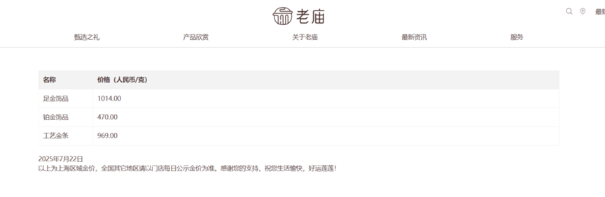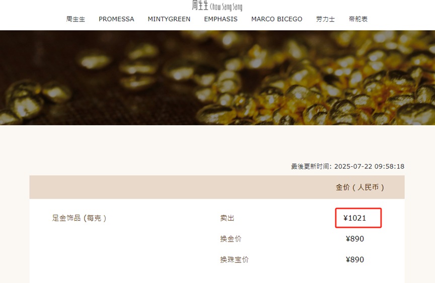 国内市场随之做出反应,有品牌金饰克价一夜之间甚至涨了10元。周大福足金饰品从1008元/克上涨到了1015元/克,周生生从1012元/克涨到1021元/克,而老庙黄金则从1004元/克飙升至1014元/克。