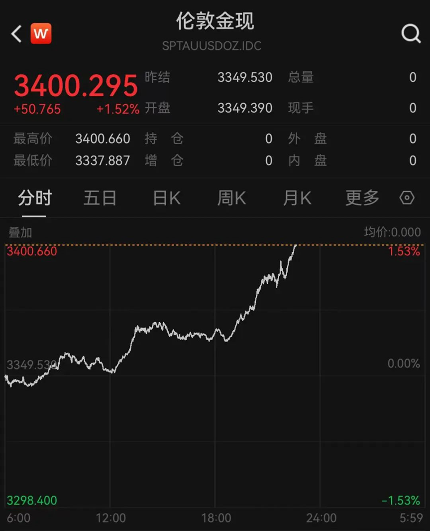 7月21日晚,现货黄金突然猛拉大涨,截至22:40,涨超1.5%,站上3400美元。